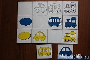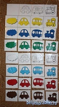 В файле для скачивания кроме цветных карточек, есть еще один лист с черно-белыми картинками (он последний). Он для тех, у кого нет цветного принтера. Этот лист нужно распечатать несколькими копиями и раскрасить в любые цвета карандашами или фломастерами. Кстати, раскрашивать совсем необязательно однотонно, можно облако раскрасить в два или три цвета, в разных последовательностях, или в кружочек, или по разному заштриховать и т.д. Тогда и транспорт нужно будет раскрасить также.