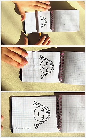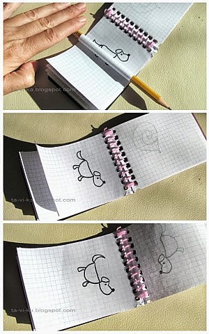 Такие картинки я делала еще в школе, а сейчас вспомнила о них, просматривая сайт "Made by Joel". Тоже принцип анимации. На одной страничке блокнотика рисуем фигуру (напр., собаку с опущенным хвостом), на второй страничке рисуем точно такую же фигуру на том же месте! с каким-нибудь изменением (напр., та же собака, только с поднятым хвостом). Чтобы нарисовать точно такую же картинку, я обводила предыдущий рисунок, положив его на оконное стекло, но, думаю, можно использовать и копирку. Теперь верхний листочек блокнота с первой картинкой наматываем на карандаш и катаем его по нижней картинке взад-вперед как скалкой. В результате кажется, что картинка двигается - собака виляет хвостом.
